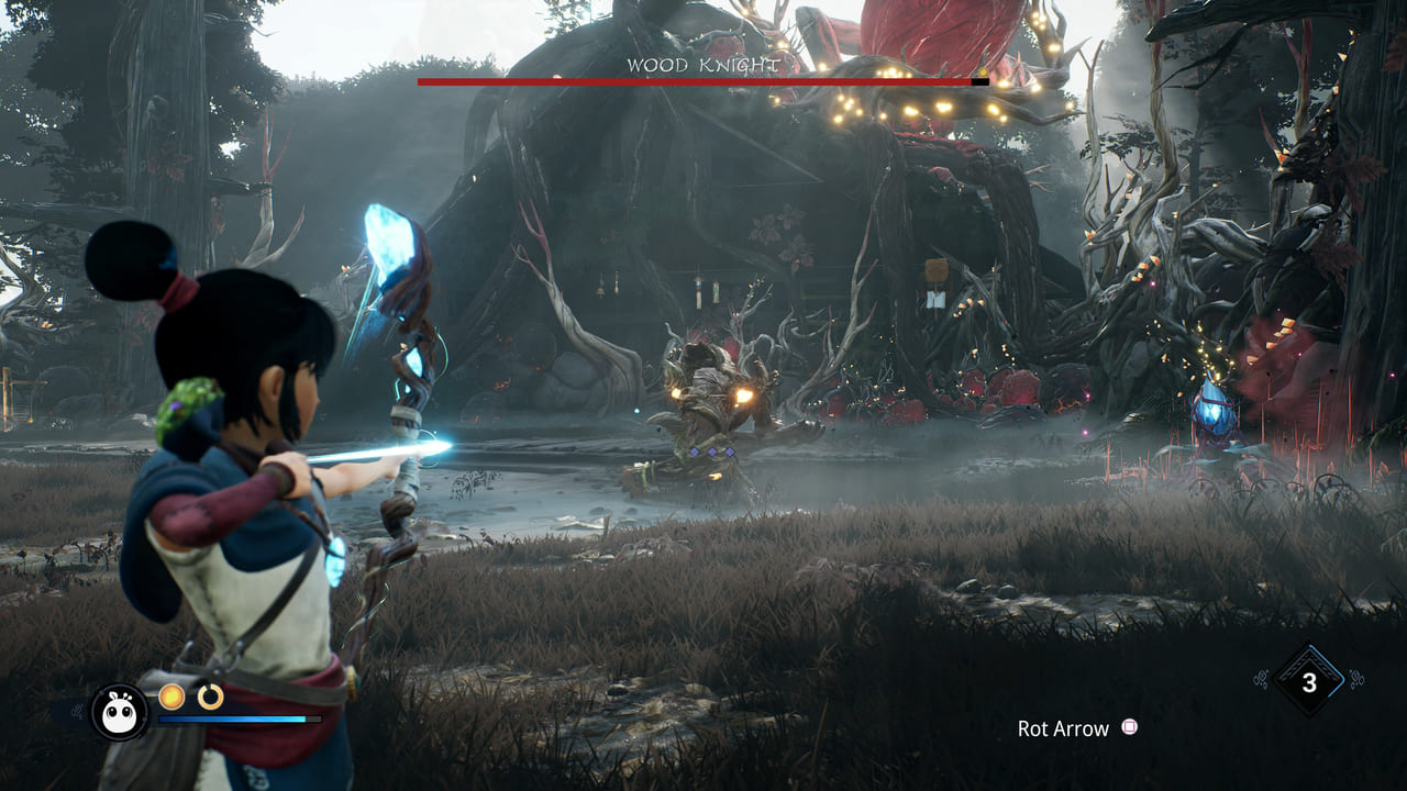 Na parte da jogabilidade podemos encontrar um controle bem simples e intuitivo, Kena anda, corre, pula, se defende com um escudo espiritual, tem dois ataques iniciais com seu cajado, um forte e um fraco mas conforme avançamos no jogo adquirimos melhorias para ele, sem falar de encontrar personagens no caminho que nos ensinam outras habilidades como por exemplo, transformar nosso cajado em um arco e flecha, os Rots também ajudam e muito nos combates, com um comando eles atacam os inimigos os deixando vulneráveis para o golpe, o que torna os combates mais estratégicos e menos difíceis. Falando em dificuldade, Kena me pegou de surpresa em algumas partes de combate que exigem bastante paciência e estratégia para derrotar os inimigos, principalmente os chefes, joguei na dificuldade considerada “Normal” e confesso que apanhei bastante ficando com vontade de jogar o controle na parede em certas partes. Eu poderia ter mudado para o modo fácil, mas o orgulho não deixou (risos), além dessas dificuldades, temos o “Hard e o Super Hard” que só é aberto após terminar o jogo, caso você seja um caçador de troféus de platina, prepare-se para terminar o jogo nesse último modo pois ele é necessário para platinar.