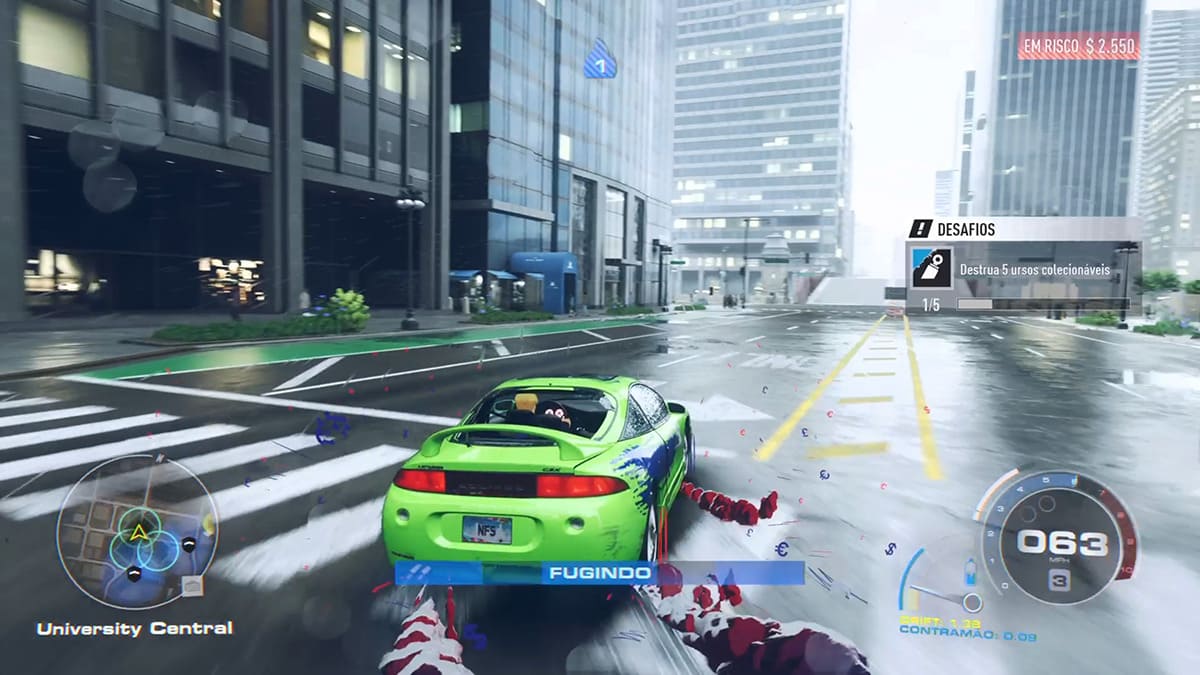 Need For Speed Unbound chega com os dois pés na porta quando se fala nos gráficos desse divertido jogo. Aqui a Criterion Games teve a ousadia de misturar gráficos realistas com personagens e efeitos de arte cartunesca. De início eu particularmente torci o nariz grandemente por achar que não faria sentido essa mistura, mas após ter o jogo em mãos consegui perceber que esse foi um dos ótimos pontos presente nele. Em outros jogos essa mistura de artes foi bem recebida (vide Fortnite com suas infinitas skins de diversos temas) e por quê não tentar isso em Need For Speed? Porém sua recepção dividiu fãs da franquia entre os que acharam ruim e os que gostaram dessa novidade. Há opções de customização desses detalhes que podem ser diminuídos, mas pra quê tirar esse charme do jogo?