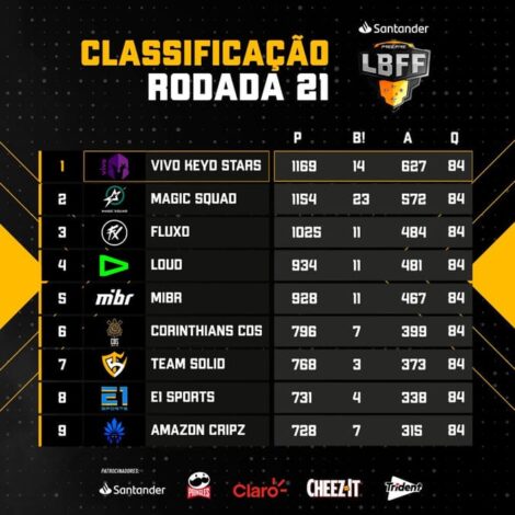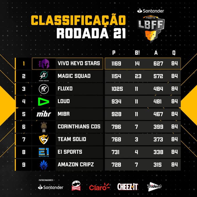 A disputa entre gigantes continua na sétima semana da Liga Brasileira de Free Fire 2023 (LBFF). Mais uma vez a semana foi marcada pela briga pelo primeiro lugar entre Vivo Keys Stars (VKS) e Magic Squad. A VKS começou forte, dominando a rodada de sábado (27), mas perdeu o ritmo no dia seguinte, com a Magic garantiu três Booyah!s no domingo (28) e se garantindo como a melhor do dia. Foi na segunda feira (29) que as duas equipes definiram que o primeiro lugar continuaria com a Vivo Keyd Stars, mas só depois de muita batalha porque a decisão foi feita queda a queda.
