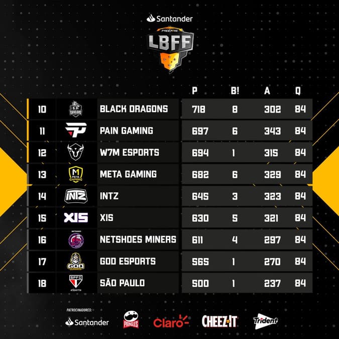 Enquanto isso no final da tabela, o São Paulo tem surpreendido e feito algumas boas rodadas. O time está perto de sair da lanterna e ser substituído pela GOD, que vem fazendo uma sequência ruim de resultados, assim como a LOUD que, apesar de estar no topo da tabela, vem decepcionando e fez seu pior dia na LBFF 2023 neste domingo.
