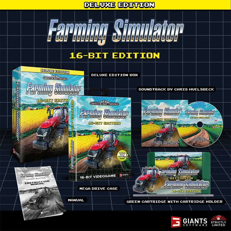A Strictly Limited anuncia o lançamento de Farming Simulator 16-Bit Edition, um título desenvolvido em parceria com a GIANTS Software para consoles compatíveis com Mega Drive. A iniciativa surge após o sucesso da Farming Simulator 25 Collector’s Edition, lançada em novembro de 2024 para PC (em versão exclusiva) e para PlayStation 5, Xbox Series X|S e PC (na versão padrão). O modelo em formato de cartucho retro, presente na edição coletor, recebeu feedback extremamente positivo de fãs e colecionadores, motivando a criação desta adaptação 16-bit autônoma.