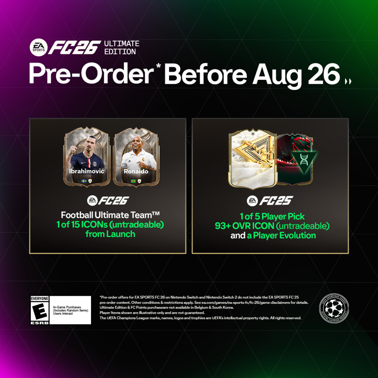 Além das novidades no FC 26, o EA SPORTS FC Mobile também está em festa. Entre os dias 17 e 31 de julho, jogadores receberão itens especiais de Bellingham e Musiala. E Zlatan retorna como Ídolo, com desafios exclusivos em sua homenagem no evento Crônicas de ÍDOLOS.