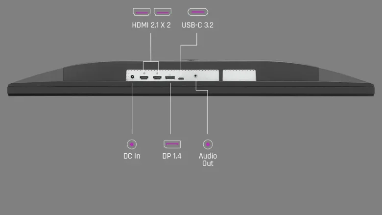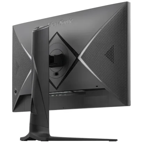 Visualmente, o Monitor Gamer XG2736-2K da ViewSonic é bastante elegante. Seu acabamento é todo em preto fosco, com bordas laterais e superiores finas, enquanto a borda inferior é um pouco mais larga, exibindo o nome ViewSonic ao centro e um LED indicador no canto direito. Na parte traseira estão dois alto-falantes de 2W, os pontos de fixação no padrão VESA 75×75, o sistema de iluminação RGB Rampage X e as conexões: duas portas HDMI 2.1, uma DisplayPort 1.4, uma USB Tipo-C 3.2, saída para fones de ouvido no padrão 3,5 mm e a entrada de energia. O controle do menu é feito por um botão do tipo joystick localizado na parte traseira.