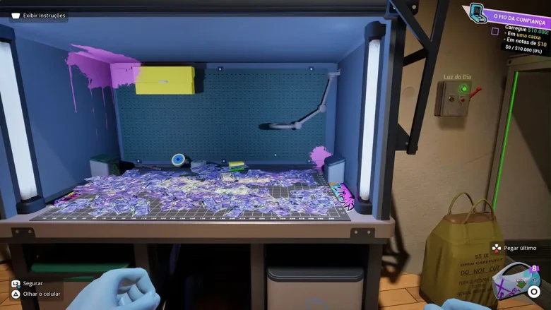 - Lavagem: Utilizando máquinas de lavar, secadoras e ferramentas específicas (como luz ultravioleta), você remove impurezas e recupera as notas. O sistema de física é um dos pontos altos, permitindo manipular pilhas enormes de dinheiro de forma bastante interativa.