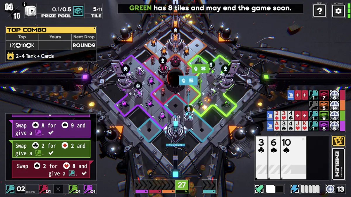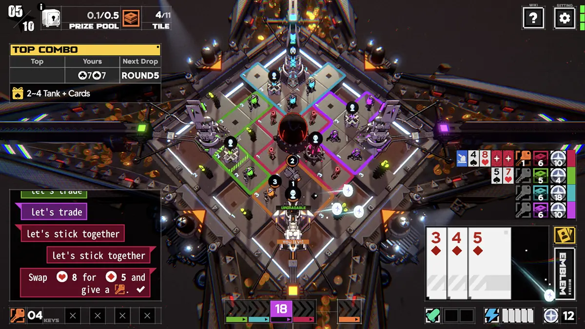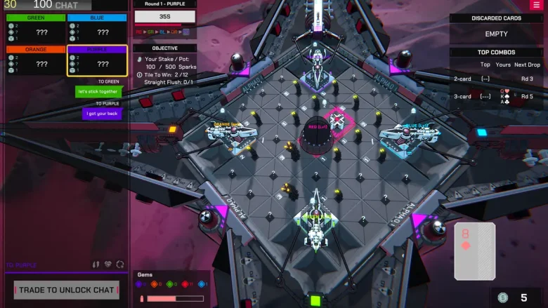 Com suporte para até quatro competidores, a vitória exige mais do que táticas simples. O jogo incentiva a diplomacia, permitindo que os usuários forjem alianças para acumular fichas, mas também abre espaço para a enganação e a traição conforme os objetivos avançam. Para vencer e garantir prêmios, é necessário alcançar o título de vitória, possuir um straight flush ou dominar a maior quantidade de blocos no mapa após superar amigos ou desconhecidos.