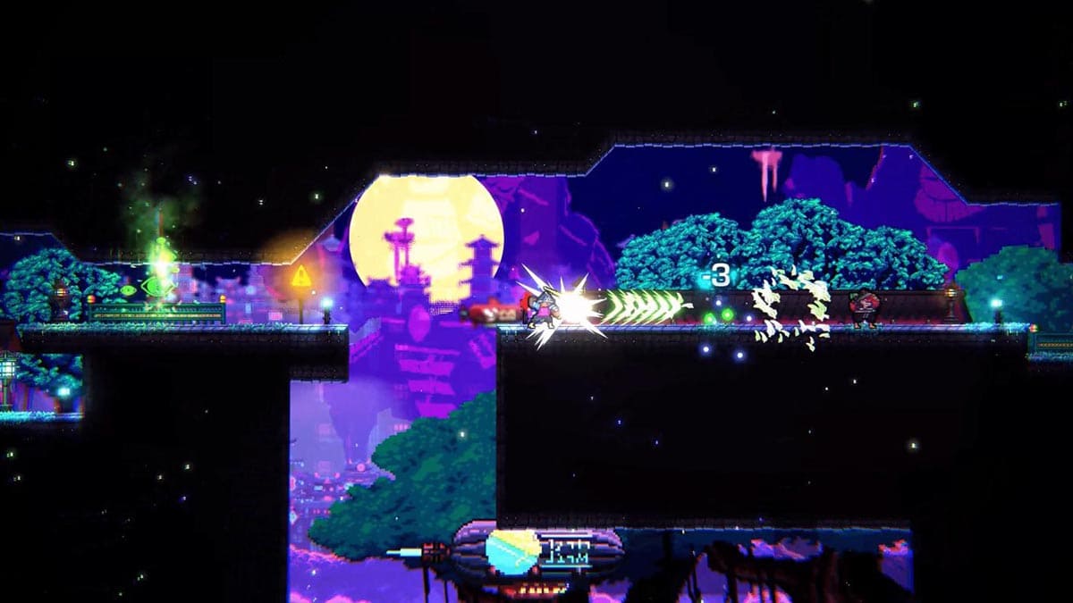- Gameplay hack ‘n slash com trilha synthwave e oito zonas roguelite.
