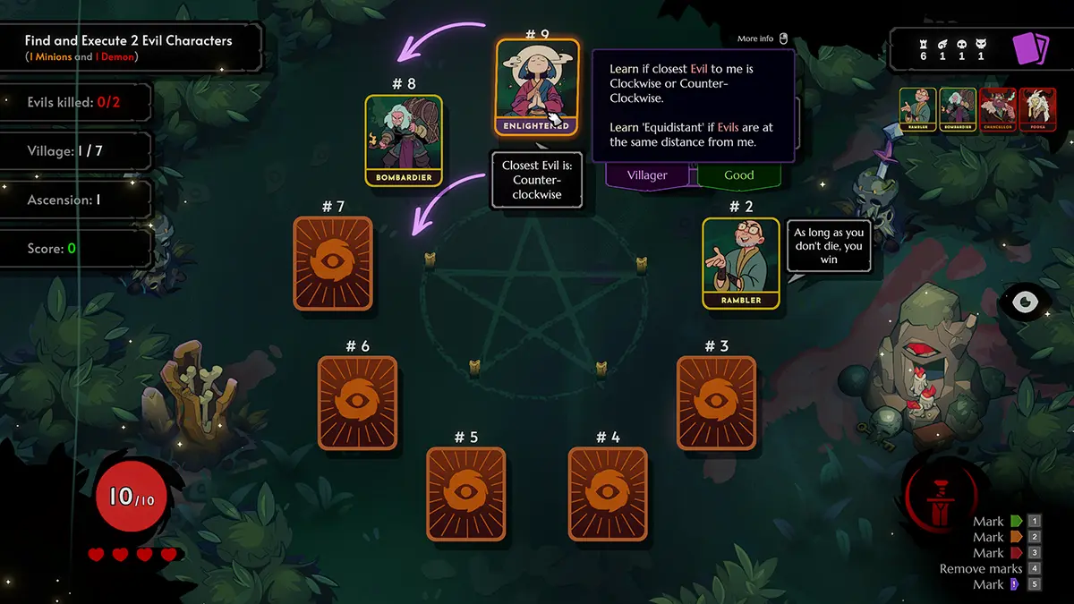 Em Demon Bluff, os jogadores têm a tarefa de analisar pistas fornecidas por cartas de Aldeões para determinar quem está dizendo a verdade e quem é um Demônio disfarçado. Ao escolher corretamente, a vila é purificada, mas qualquer erro resulta em fim de jogo, exigindo o início de uma nova run. Essa premissa de dedução social single-player levou o título ao Top 400 do Steam, acumulando cerca de 140 mil adições à lista de desejos.