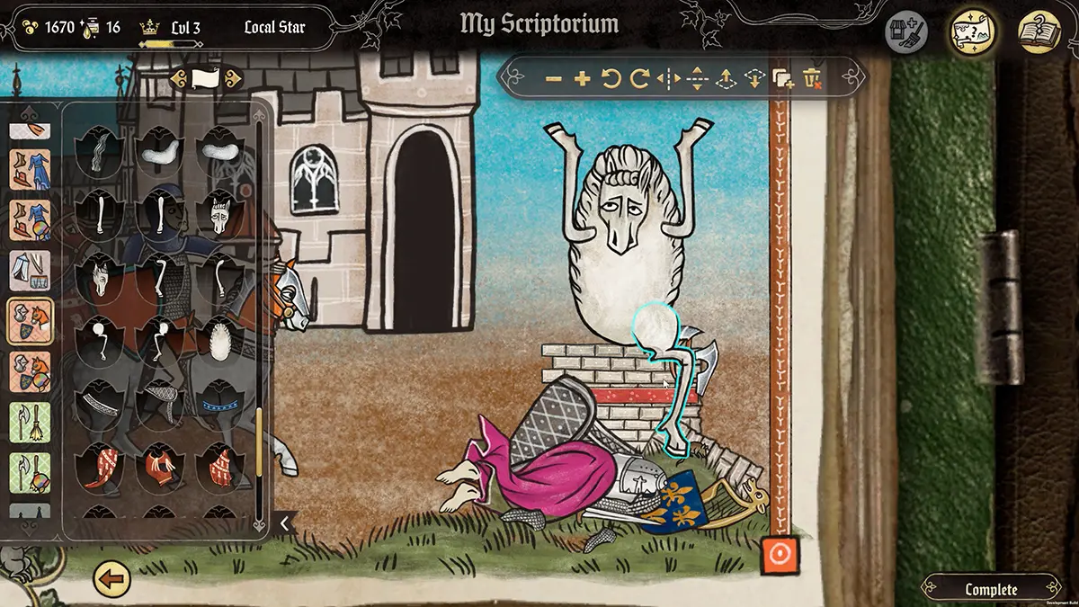 Para quem prefere focar exclusivamente na arte, o Modo Sandbox oferece acesso total à biblioteca de ativos medievais, sem a necessidade de cumprir prazos ou exigências de clientes. O sistema utiliza mecânicas de “arrastar e soltar” com elementos inspirados em manuscritos e iluminuras históricas reais, permitindo a criação de iniciais ornamentadas, bordas detalhadas e outros elementos visuais clássicos.