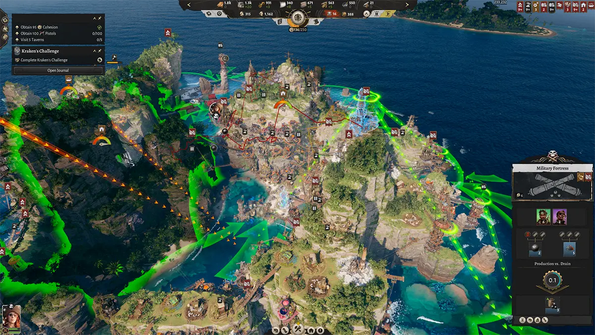 A governança também desempenha um papel fundamental, exigindo que o jogador atenda às necessidades de uma tripulação turbulenta. Isso inclui o fornecimento de itens básicos e temáticos, como roupas, cerveja, sabres e tapa-olhos, para atrair e manter novos piratas no assentamento. O desenvolvimento da sociedade é pautado por quatro eixos principais: Notoriedade, Império, Navegação e Riqueza, sendo que cada um desbloqueia missões, edifícios e navios exclusivos.