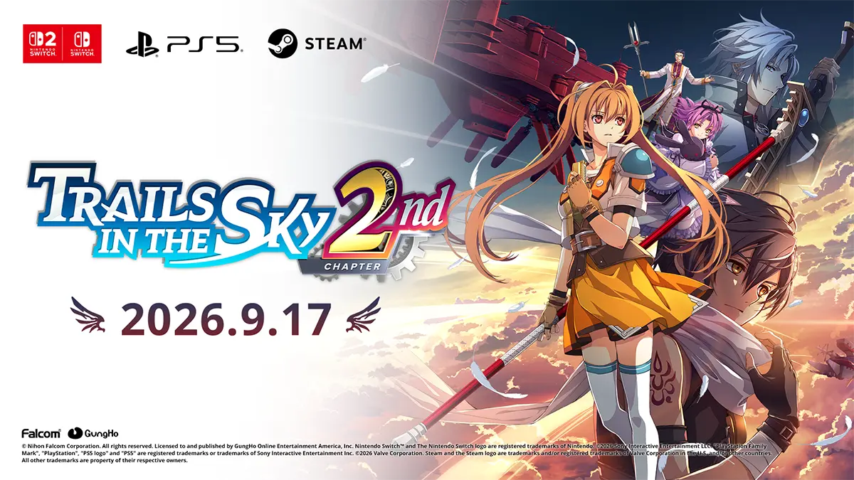 A GungHo Online Entertainment America anunciou que Trails in the Sky 2nd Chapter será lançado em 17 de setembro de 2026. A reimaginação moderna do aclamado RPG da Nihon Falcom terá versões para PlayStation 5, Nintendo Switch 2, Nintendo Switch e PC via Steam. O anúncio foi acompanhado por um trailer inédito de gameplay e a revelação de novos integrantes do elenco de dublagem em inglês.