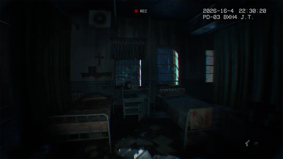• Gameplay em primeira pessoa com perspectiva de bodycam em um hospital abandonado.