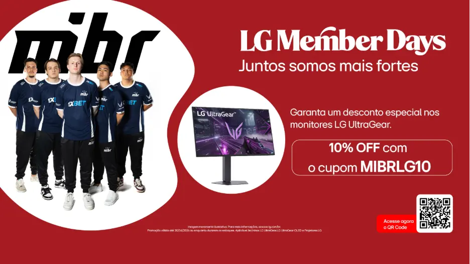 Durante o período da campanha Members Day, consumidores podem acessar condições especiais em diferentes categorias de produtos da LG. No caso da linha gamer, o cupom adicional de 10% em parceria com a MIBR amplia as vantagens para quem busca monitores de alta performance.