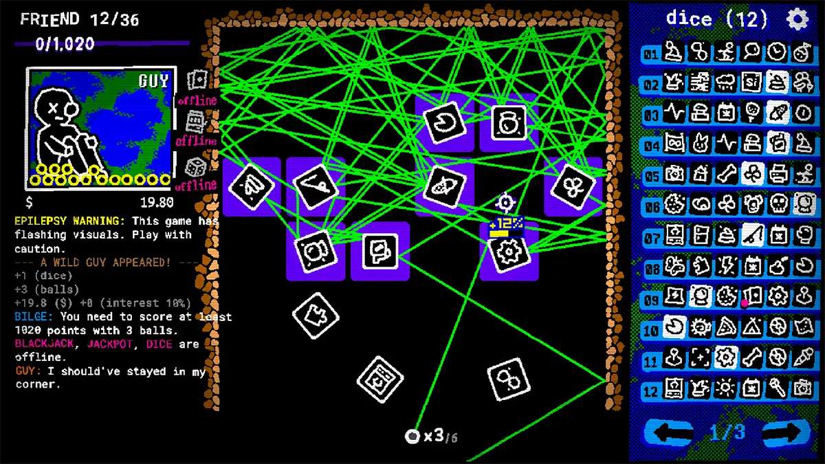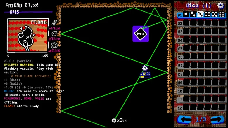 Em STICKER/BALL, o jogador dispara bolas para atingir dados e acumular pontos, podendo aproveitar ricochetes para ampliar ainda mais a pontuação. Ao longo das partidas, é possível desbloquear adesivos que alteram a dinâmica do jogo de diferentes formas.