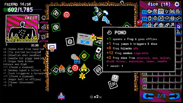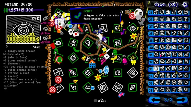 Esses stickers incluem elementos variados, como aranhas, fezes e palhaços, e interagem entre si de maneiras incomuns. Por exemplo, fezes atraem moscas, enquanto aranhas criam teias que capturam esses insetos, gerando ainda mais pontos. O sistema incentiva a combinação desses elementos para criar sequências cada vez mais eficientes.