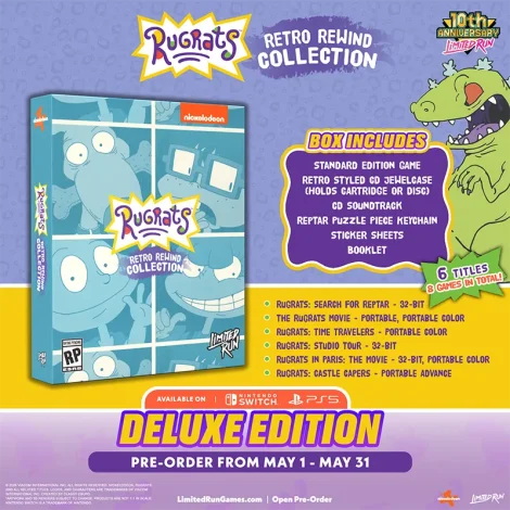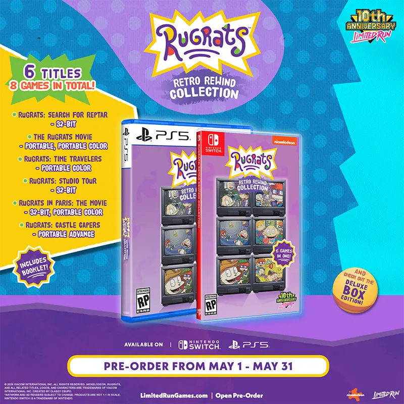 A Limited Run Games anunciou Rugrats: Retro Rewind, uma coletânea que reúne seis jogos clássicos da franquia dos anos 90. O pacote será lançado em versões física e digital para Nintendo Switch e PlayStation 5, com início das pré-vendas em 1º de maio de 2026 e disponibilidade digital a partir de 15 de maio.